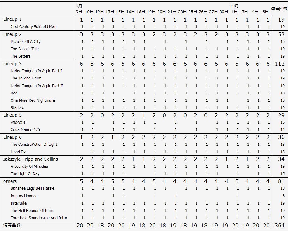 2014年段階のキング・クリムゾンのレパートリーは21曲で2時間のライヴで18から20曲が演奏されていたため、日によっての変化は演奏する曲自体ではなく演奏する順番であった。